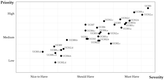 The prioritization of all use cases as the average interviewee assessment illustrates Figure 3. As can be observed, use cases with a low (high) priority were also evaluated with a low (high) severity. The prioritization serves as a basis for deciding which use cases and respective requirements will be implemented first in the implementation phase of the assistance system development. In the given prioritization, use cases UC001, UC008.a, UC012.a, UC012.b, UC012.f and UC003.b represent those with the highest priority and severity.
