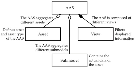 In addition to the classes presented here, the meta-model of the AAS consists of other classes that refer to, e.g., security, types, and submodel elements. However, these classes are of no further relevance in the remainder of this section. Furthermore, there is already documentation on export formats such as XML (Extensible Markup Language) and JSON (JavaScript Object Notation). The Industry 4.0 platform provides a class diagram for the management shell but no direct implementation. Therefore, initiatives for implementations have been realized by research projects (TeDZ, BaSys 4.0) and companies (AASXPackage Explorer, AASX-Server).