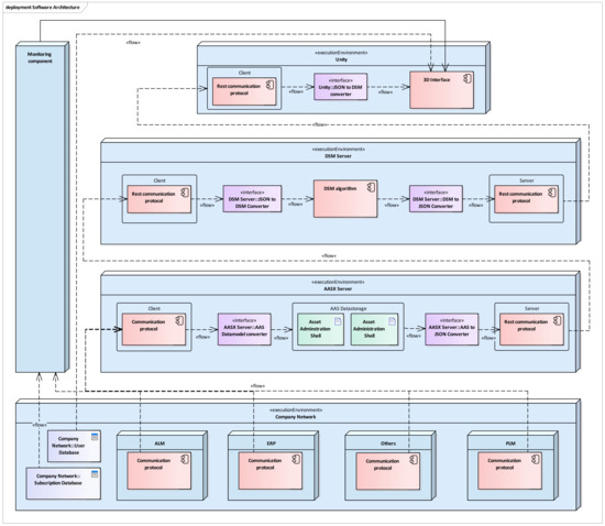 The system architecture in Figure 5 consists of four system blocks. The Unity, DSM server, and AASX server blocks form the three-layer architecture of the actual assistance system. The Unity block provides the 3D interface, that is, the interaction interface between user and system. The DSM server contains the logical processes for evaluating data from the AAS with the help of DSM algorithms. The AASX server is the data consolidation layer, in which all the company’s information is converted into a uniform data model. The information carrier in this diagram is the corporate network, which provides both the authoring systems and databases for users and artifacts. The last element in the software architecture is the monitoring system, which constantly monitors the authoring systems and informs the users of any changes.