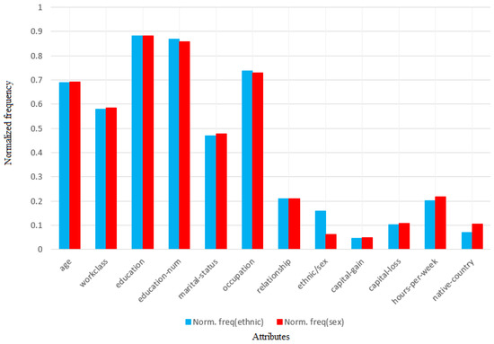 So, for example, from Table 1, we can have a g e 3 , e d u c a t i o n 6 , m a r i t a l _ s t a t u s 0 or o c c u p a t i o n 0 (where the superindexes denote possible data values), which will be actually written as a g e ( 3 ) , e d u c a t i o n ( 6 ) , m a r i t a l _ s t a t u s ( 0 ) , and o c c u p a t i o n ( 0 ) .
