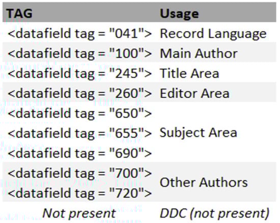 Libraries are increasingly transitioning from manual retrieval systems such as traditional card catalogs to the use of online public access catalogs (OPACs) as information retrieval systems, which are characterized by short bibliographic records of the books, journals, and audio–visual materials available in a particular library [1]. The use of OPACs has greatly changed the nature of libraries and how users access information resources by opening up a variety of portals through which they can access and retrieve information. Currently, the convergence of computers and telecommunications technology has made activities possible that were considered impossible in the past [2], but still with some limitations. If one hears somebody saying, “I bought a new flat” or “I bought a new house”, all of us would understand that they are speaking about the place in which they are going to live and that the two terms are used as synonyms. We have the ability to understand the text and abstraction. It is not so simple for a machine, and specifically for a library catalog (OPAC), to understand how house and apartment/flat are used as variants of one another. In general, an OPAC search function performs a linear scan of all the words in a catalog, and if it does not find the exact term sought, no results are returned. The output is based on the insertion of metadata generated by codified operations related to the description of the cataloging material. Many library classification schemes have been developed since the 19th Century [3]. Some even recently have been provided by Common Language Resources and Technology Infrastructure (CLARIN) (https://www.clarin.eu, accessed on 9 November 2021), which has initiated the Component MetaData Infrastructure (CMDI) to overcome the dispersion of data formats and first examples of the creation process for a CMDI metadata profile [4,5,6]. The most important international classification systems are the classification of the Library of Congress (LCC) (https://www.loc.gov/catdir/cpso/lcco/, accessed on 9 November 2021), the Dewey Decimal Classification (DDC) (https://www.oclc.org/dewey/features/summaries.en.html, accessed on 9 November 2021), the Universal Decimal Classification (UDC) (http://www.udcc.org/index.php/site/page?view=about, accessed on 9 November 2021), and the Information Coding Classification (ICC) [7]. A variety of classification schemes have also been generated by public and university libraries. Until now, categorization of library books has mostly been undertaken manually using one of these standards. We had, in a previous work [8], also created a complete suite for analysis in digital humanities that allows managing metadata. However, the accuracy of manual classification depends on the librarian’s vast knowledge base of various subjects and disciplines. It is not unusual to find errors in such classification, for example a book on neural networks may be wrongly classified under computer networking. Automatic book classification, i.e., a system that helps construct class numbers using the electronic version of a book classification scheme, is more useful for managing print collections of books and other similar forms of documents. Unfortunately, the nature and quantity of the literature available mean that automatic classification has yet to gain the desired momentum. Nevertheless, research on automatic book classification is being undertaken, and literature on this topic does exist, including literature that discusses the applicability of the principles and practices of bibliographic classification to automatic text classification. For example, Yi [9] reviewed the tools, methods, and models developed for automatic text classification, which are based on bibliographic classification schemes, and discussed the issues and challenges in the adoption of bibliographic classification schemes in automatic text classification. A classifier tries to evaluate whether or not a book can be included in a particular grouping. The most common data used to describe a work are title, author, and publisher. There are also subjects and the DDC fields, which are not always present in all catalogs. The aim of this work is to understand whether it is possible to identify a strategy to automate the classification operations, allowing decisions about the inclusion or exclusion of a book, in a given category, based on a few descriptive elements. This work focuses on the content of the Edisco catalog, an electronic database that aims to register the books for school and education published in Italy between 1800 and 1900. Using an existing and proven database is particularly important as the records are not subject to further classification and their inclusion has already been assessed. The records constitute the information that the classifier will use when evaluating new elements in order to produce positive feedback to a search query. The machine should compare the incoming metadata with those in the database and be able to provide reliable answers. The records are accompanied by numerically identified tags. The most relevant are shown in Figure 1. Note the remarkable absence of the DDC field.
