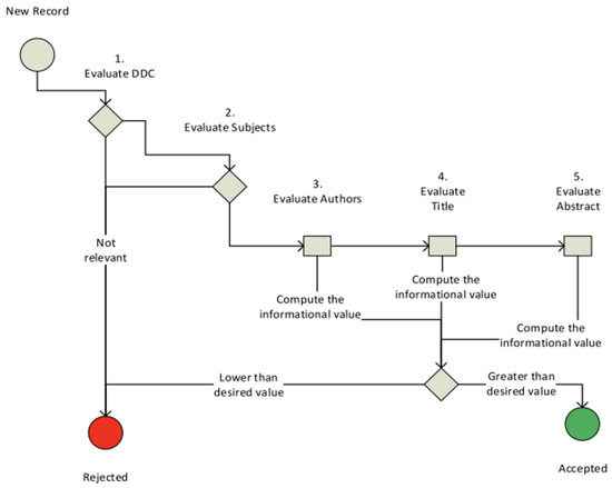By executing the five phases in sequence (see Figure 2), the classifier should associate a value with each operation, in some cases a Boolean value, whether accepted or not, and in others, a quantitative value. The goal is to transform the cataloging operation into a classification system based on quantifiable metrics. At the end of the sequence of operations, it could assign a confidence value, used to consider whether a record belongs to the desired category.