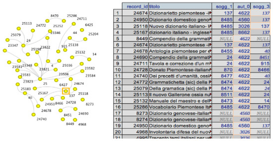 Asking the system to generate the graph of relations dependent on the four authors connected in column aut_0, a network of 40 records was obtained. These in turn had a total of 13 connected subjects (see Figure 4).