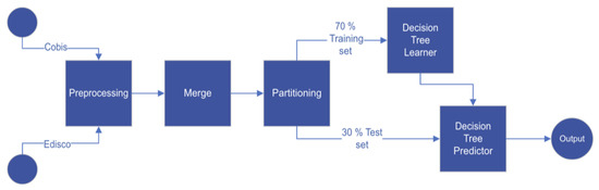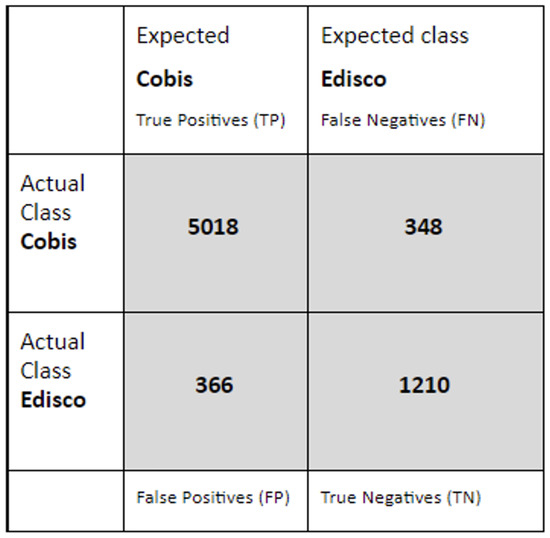 The decision tree algorithm operated by splitting the training set each time features with a value greater than specified occurred. The reference target variable was of a discrete type and was set during the preprocessing phase. The quality measure used was the Gini index, which minimizes the variance. The split operations were performed once the average value of the two partitions had been calculated. The size of the tree was limited during the training operations, by dictating that the minimum value for each node be equal to two and subsequently performing reduced error pruning operations. This was in order to reduce classification errors, minimizing the risk of overfitting in the model. Algorithms that start from the leaves replace the nodes that have derived them with the most suitable class, but only if the level of accuracy of the prediction remains stable. For nodes that did not return a result (no true child problem), the decision tree algorithm was set to return a value of NULL. To study the progress of the classifier and carry out an evaluation of the model, the contingency table (confusion matrix) was generated (see Figure 6). It presented different combinations of predicted and actual values taking into consideration the two datasets used: Edisco and CoBiS.
