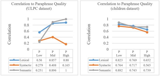 Figure 1. Correlations between paraphrase quality and the three rubric scores: semantic similarity, lexical similarity, and syntactic similarity for the children and ULPC datasets.