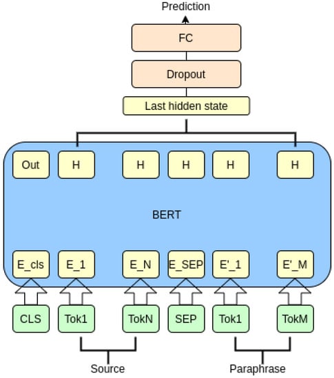 The third model relies on a pretrained BERT-based model from the Huggingface library []. For simplicity, a small version of BERT was used (identified as “bert-base-cased”). This model is composed of 12 layers comprising 110 million parameters and was trained on English texts from the BookCorpus and English Wikipedia. The two input sentences are passed to the model as a single string delimited by a special separator. The output of the BERT model goes into a Dropout layer, followed by a fully connected (FC) layer, which makes the final 2-class or 3-class predictions, as shown in Figure 3. In case of transfer learning experiments, this final layer was replaced by a random layer, keeping the remainder of the ensemble unchanged. Different learning rates were considered for BERT and FC components in order to help the model learn new patterns, while keeping as much as possible of the initial BERT pretrained knowledge.
