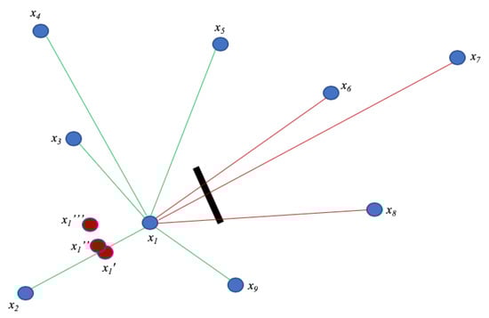 Therefore, angles and missing distances can be found from known distances. In an ideal world, properties (20) and (21) are verified for each observed triangle ( and ()). In a noisy measurement scenario, inconsistencies are found. For example, an evaluation of the triangle may be consistent with the left side of Figure 3, but an evaluation of triangle may position in the hashed representation of the right part of Figure 3. It would be algebraically tempting to resolve as the middle point between both possibilities (mean error). However, this is not the best solution. In Figure 3 simplified example, the most probable reason for the inconsistency is the presence of an obstacle or reflection source between and . If all distances are approximations, some of them being close to the ground truth and some of them displaying a larger k factor, a congruent representation of such asymmetry is that k is larger for than it is for the other segments. Quite obviously, other possibilities can be found. For example, in the individual triangle , it is possible that k is larger for the segments than it is for segments and . However, as is compared to other segments and the same anomaly repeats, the probability that the cause is an excessive stretch on increases.