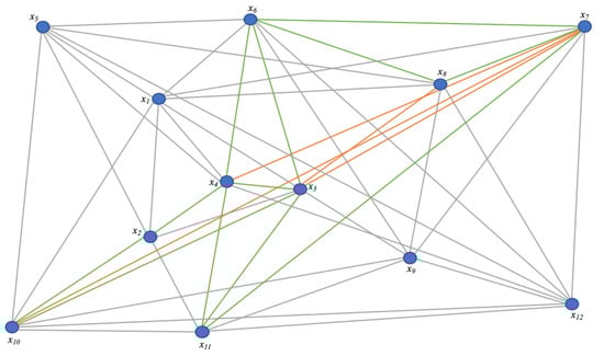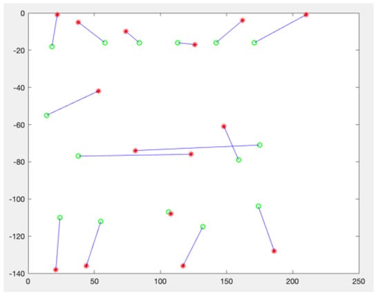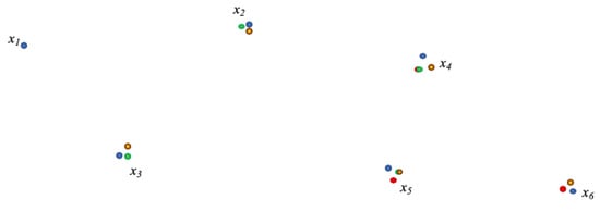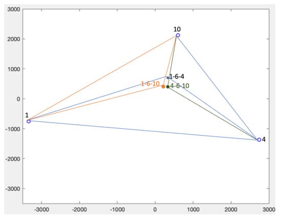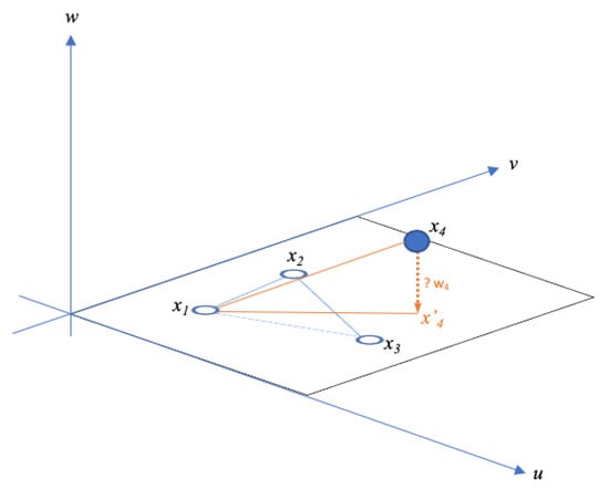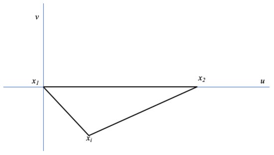 We want to graph the position of each point in the sub-matrix. A pivot is chosen iteratively in . In the first iteration, , then in the second iteration, and in the last iteration. For each iteration, is set as the origin, and . An example is displayed in Figure 5. The next point in the matrix () is iteratively set along the x-axis, and . If , then the position of each other point of the set is found using standard triangular formula illustrated by the points in Figure 5 and where: