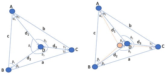In such case, using a centering technique to average the error may make sense algebraically, but not geometrically. Finding a method to reduce the error while detecting its directionality is therefore highly desirable. Luckily, geometry provides great methods to this mean, that only have the inconvenience of requiring multiple comparisons. Such process may be difficult when performing individual and mobile station ranging, but becomes accessible when all sensors are static. When implemented in a learning machine, this method can be implemented at scale and reduce the distance error only when it is directional, thus outputting a matrix which k factor is closer to uniformity. It should be noted that the purpose of such method should not be to fully solve the MDS problem, as some pair-distances are usually not known, and the method has a limited scope (i.e., it cannot assess some of the pairs, as will be seen below). However, in many cases, sensors can be found that display interesting properties displayed on the left part of Figure 3. In this scenario, 3 sensors and are selected that form a triangle. The triangle represented in the left part of Figure 3 is scalene, but the same principle applies to any triangle. A fourth sensor is found which distance to and is less than or , thus placing within the triangle formed by .