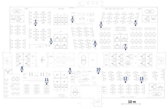 We tested this method in five different buildings already equipped with Wi-Fi APs providing active coverage. As the active APs do not support FTM, we position FTM devices near each active AP (typically 15 cm, of half a foot, from each active AP position). Building 1 is a three-storey office building with cubicle areas alternating with blocks of small offices. Our testbed is installed on the second floor. Building 1 is interesting, because the wall structure is irregular, causing different reflection and absorption patterns for each AP pair. The test floor is already equipped with 13 access points positioned at ceiling level. We therefore positioned 13 FTM stations at ceiling level, one near each AP, as represented in Figure 7.