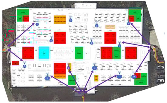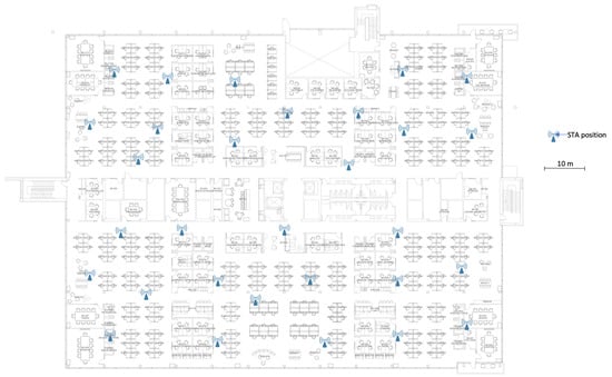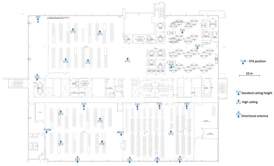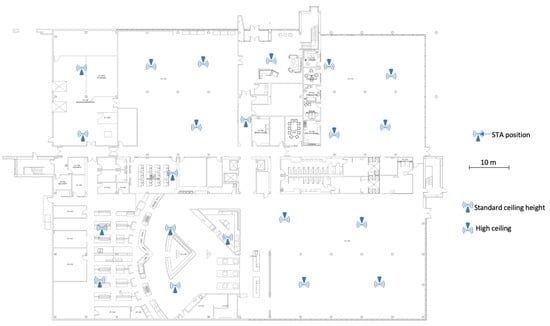 Building 3 is a large open space building with partial high ceilings, used as an enterprise restaurant. It presents high peaks of user and Wi-Fi traffic alternating with no activity. This traffic pattern allows us to evaluate the effect of traffic (or lack thereof) on ranging accuracy. Additionally, the building structure makes that AP height is not consistent throughout the floor, thus presenting an interesting geometry. Building 3 is represented in Figure 9. High-ceiling APs are represented by upside down icons. In this setting, all APs are the same model and use omnidirectional antennas. Thus, the only difference between APs is their height, 3.2 meters for standard ceiling heights, and 7.3 meters for high ceiling APs. Our FTM devices are positioned near each AP as in the previous buildings.