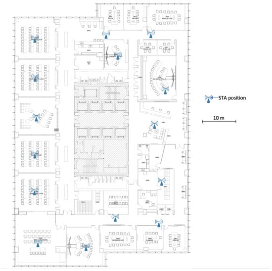 Building 5 is a training center with small to medium-sized classrooms. It presents an interesting denser wall structure (as walls separate the classrooms). As represented in Figure 11, each classroom has its own AP in the center. The dense (hashed) non-accessible technical area at the center makes that APs on one side do not detect APs on the other side.