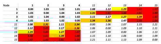 Comparable display is visible in the other buildings. FTM devices near APs on high ceiling display large distance stretches when ranging against devices near APs on lower ceilings, but devices at the edge of both domains display LoS distances and link both domains. The Geometric Wall Remover correctly identifies the high ceiling / low ceiling distant pairs as stretched, which a subset is illustrated in Figure 15. Here as well, highlighted in yellow, orange and red the distances that the geometric wall remover engine identifies as deviating from the others (small, medium or large identified deviation, respectively). High ceiling APs are 1 to 4, APs in low ceiling are 11 to 15, in italic.