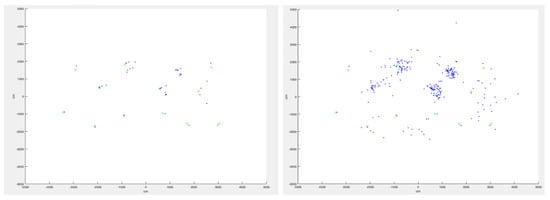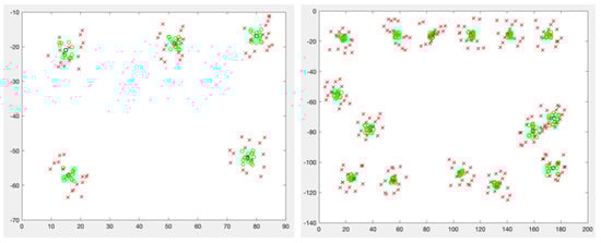 The process repeats iteratively. With smaller matrices and more combinations, clusters start to appear for each sensor, with various densities. In buildings 3 and 4, APs and devices in individual zones (low ceiling or high ceiling) are in LoS condition to each other. This is visible in Figure 17 (left), where a subset of building 3 is displayed (APs in the upper left part of the building). Green circles represent LoS (same height) matrices, while red crosses represent matrices with cross-height distances. The same density difference can be seen in building 5 (Figure 17 right), where APs/devices on the same side of the central block display close measurements (narrow clusters) while measurements through the block, when they succeed, display large variations (larger clusters).