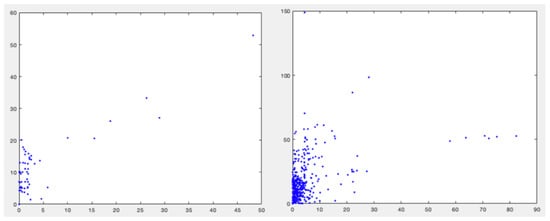 Size 9 matrix positions (left), and size 8 matrix positions (right), before outlier filtering, in building 1.