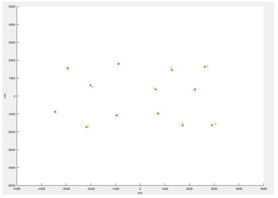 where thus expresses the mean radius of the cluster. By comparing radii between clusters, points displaying large values are surfaced. Different comparison techniques can be used for such comparison. We found efficient the straightforward method of using the rule, where a cluster which radius is more than 2 standard deviations larger than all clusters mean radii is highlighted as an outlier. The associated sensor therefore displays unusually large noise in its distance measurement to the other sensors, and is therefore a poor anchor. Matrices using this sensor as an anchor are removed from the batch and clusters are recomputed without these sensors’ contribution as anchors. As the computation completes, each cluster center is used as the best estimate of the associated sensor position. By reducing the variance of the dilation factor k, by removing sub-matrices and sensor pairs that bring poor accuracy contribution, this method outperforms standard EDM completion methods when is known, because it reduces asymmetries before computing positions, but also because the geometric method tends to rotate the asymmetries as multiple small matrices are evaluated, thus centering the asymmetries around the sensor most likely position.