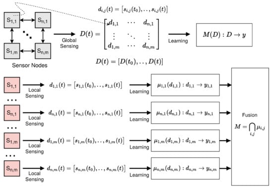 This is the inference by and training of n × m multiple predictive model instances μi,j (distributed model ensemble) related to sensor nodes Si,j with local sensor data processing. Time-resolved local sensor data series di,j(t) at a specific spatial position p(S) of node Si,j is processed by each instance of the ensemble locally and independently. Each instance estimates a local state st and delivers a local feature vector f(p)i,j. All local states are finally fused to a global state ST delivering a global feature vector F by a fusion function Φ(μ1,1, μ1,2,…,μn,m) with index n and m as the number of nodes in each dimension.