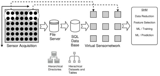 Sensor processing and data flow in the structural health monitoring (SHM) system in this work. Central part is the computation of virtual sensors arranged in a spatially two-dimensional sensor network. The dotted arrows show the relation of physical sensors and their sensor positions with virtual sensor nodes (a set of physical sensors are mapped on a virtual sensor).