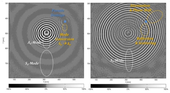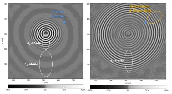 SHM based on Lamb waves and ultrasonic measuring techniques enables the detection of different kinds of structural damages and their localisation [,]. However, the presence of at least two Lamb wave modes (symmetric modes, S0, S1, S2, …, and anti-symmetric modes, A0, A1, A2,…) at any given frequency, their dispersive characteristic and their interference at structural discontinuities produce complex wave propagation fields. Due to the complex wave fields, conventional algorithms are reaching their limits for robust damage detection and localisation with the application.