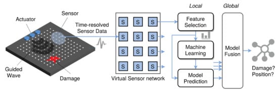 There is no sensor interaction in terms of communication; the distributed sensor signals are correlated by the wave propagation. A single sensor node processes only its local sensor and passes the pre-processed data to its local learning instance only predicting the local state (e.g., a damage nearby), discussed in the next sections.