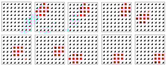 Typical examples of auto-encoder-based damage feature extraction. Shown are intensity images of the AE processed DWT features (i.e., each pixel of the image has a binary value and yellow colour indicates a detected anomaly); x- and y-axis in pixel coordinates, defect index is numerated from left to right and top to bottom (totally 9 defect positions).