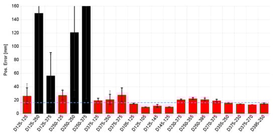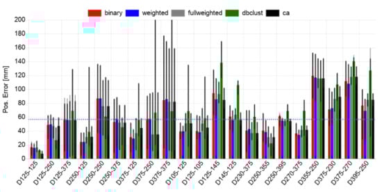 Results of the base-line approach using the auto-encoder output and density clustering feature extraction are shown in Figure 18. The accuracy measures are derived from all three data sets by Monte Carlo simulation adding Gaussian noise to the originally measures data sets. Some samples show false-negative predictions (indicated by black bars in the plot, typically 10–20% of the samples of one experiment). The training was only performed with the sensor data from the defect-less experiment. In contrast to the first local multi-instance learning, the global single-instance learning shows some false-negative predictions, i.e., no defect (position) was detected in case of an existing defect, indicated by black bars. The maximal prediction error occurs by a defect placed in the centre of the plate near by the actuator. The mean position error averaged over all sets and neglecting the three high error cases (D125-250, D250.250, and D250-375) is about 18 mm. The high position errors of the three aforementioned cases are a result of a low-contrast feature marking with fuzzy boundaries of the point clouds and high noise areas at the edges and corners of the plate due to wave interaction artifacts).