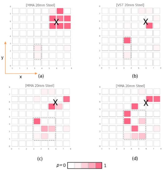 Typical examples of the post-processed images are shown in Figure 16. The dependency of the position accuracy with respect to the sensor-actuator-damage configuration is shown in Figure 17. Damages near by the actuator (nearly in the plate centre) cannot be detected accurately. There are feature activations near by the edges and corners of the plate due to wave reflections, interferences and mode conversions (conversion of one Lamb wave mode into another mode). These artifacts disturb the damage prediction and localisation. Moreover, in this work a specimen structure consisting of only one composite material is considered. Hybrid structures in terms of combined section regions of different materials, e.g., with intermediate stringers, will pose similar artifacts.