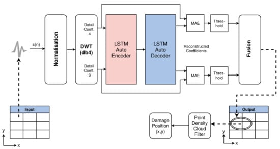 Note that there is no data labelling performed. The single model instance is trained with all spatial data points (250 × 250) sequentially from the original scanned ultrasonic measurements. The training is performed again with a network activation of the down-sampled and DWT feature transformed input data sequence, with a following back propagation of the prediction error. In this case the error is defined by the difference between the input signal and the reconstructed output signal by the auto-encoder and decoder. Details of the network architecture can be found in the next section.