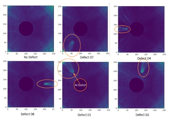 Therefore, the ML algorithms detect mainly amplitude reduction (STMP) behind the defect, scattering (MTMP) and phase shift (STMP) of first arrival of the wave propagating from the actuator to the sensor. This is shown in Figure 20.