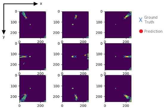 Spatial accuracy of the auto-encoder-based damage feature extraction with real damage positions markings (ground truth, blue cross) and the damage position approximated by DBSCAN (red circle); x- and y-axis in pixel coordinates.