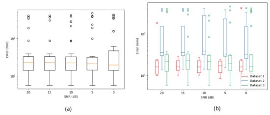 Statistical analysis of the dependency of the position error on an artificial noise level added to the sensor signal. (a) Averaged over all data sets; (b) averaged over a specific data set. Single points are outliners.