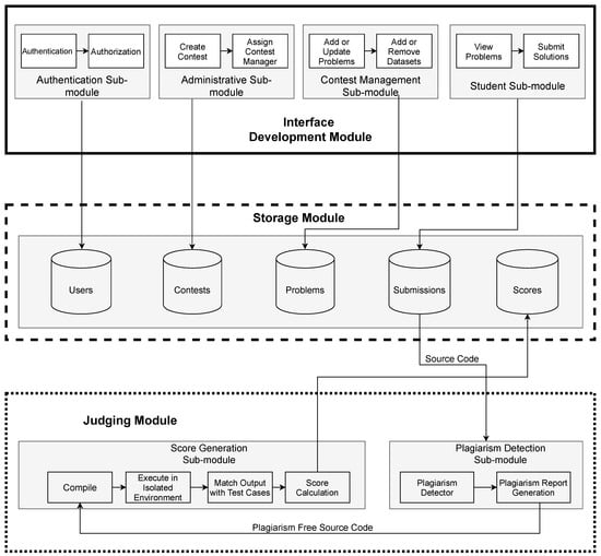 The proposed system comprises three main modules. These are interface development module, storage module, and judging module. All of the modules are interconnected with each other. Figure 1 depicts the overall architecture of the proposed system.
