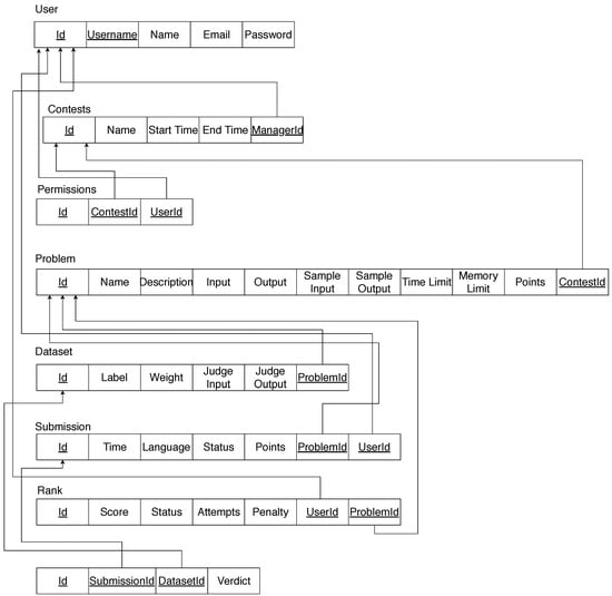 For the proposed system, a relational database system is used for storing all of the necessary information. There are five entities in the database: User, Contest, Problem, Submission, and Score. Figure 2 depicts the relationship mapping diagram. The user entity contains information regarding the users. The contest entity holds the problem details provided during the contest.The problem entity is used to store test cases to evaluate the submitted solution. The submission entity contains the source codes that were submitted during the contest period. In addition, score entity is used to store the score of the contestants.
