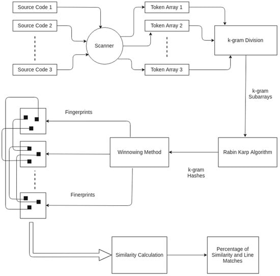 - Schleimer, S.; Wilkerson, D.S.; Aiken, A. Winnowing: Local algorithms for document fingerprinting. In Proceedings of the 2003 ACM SIGMOD International Conference on Management of Data, San Diego, CA, USA, 10–12 June 2003; pp. 76–85. [Google Scholar]