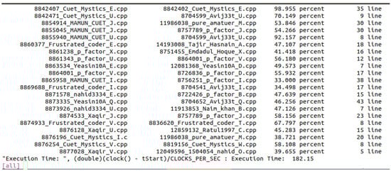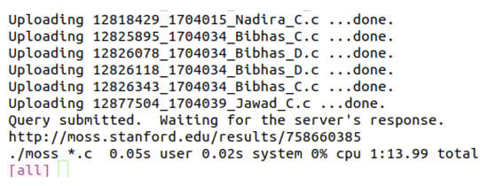 We compared our system to the commonly used MOSS to illustrate the proposed method’s time efficiency. Table 7 shows the attained result for MOSS and our proposed system. It took MOSS 1 min. 13 s to provide us the result, whereas our system took 1.4 s. Even though MOSS is effective and commonly utilized in academic practices, our plagiarism identification allows for us to use it from a local server and save time on request-response. MOSS’s output representation is not well-organized. It displays a similarity report for each pair of source codes uploaded. Our method displays the best match for a particular program. Another issue with MOSS is that, although it is free to use, the details of how it was produced are still unclear. Schleimer et al. [] published the base method of their system—the winnowing method, which we implemented this system, and, by doing this, we opened the door to work on this project more specifically and solve limitations that MOSS has. Figure 5 depicts the runtime of MOSS on data set 2.