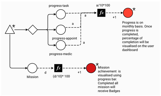 First, the design is based on self-management elements in the gamification for the chronic illness framework in [13] and application of fun elements in motivating a person to sustain their engagement with a health-based gamified application [4,10,13]. With this in mind, the implemented game elements were a logbook (record-based), data visualization (graphs), and alerts. A logbook is any recorded data that relates to given features, such as data concerning medication, appointments, or tasks. For each type of data, the rate of completion is visualized in the form of percentages, using a circle graph on the user’s dashboard. Alert messages pop up to remind the user when any of the data is reached or if the given due date has passed. Meanwhile, the selected fun elements are missions, the progression bar, avatar, and badges, as well as the challenges in the mini games. The element of missions in the gamified application allows users to set targets to improve their health condition. The achievement of the missions is visualized through the progression bar. Users will be intrigued to see their progress over time. When any mission is achieved through completing several tasks, a badge is awarded. This badge shows the specific achievement of the users, after which a different user status (novice, intermediate, advanced) is displayed on the user’s account. This situation is anticipated to influence the users’ engagement with and behavior toward better health self-management. The simulation model is illustrated in Figure 2. The simulation is using machination diagram. As shown in the simulation, the sources are the data log from the users, in which the data are pooled according to its purpose and indicated by the progress mode. In the simulation, ten data pools were set to be achieved. Once completed, the data are pushed automatically (*) to another pool to indicate the data have been visualized on the application.