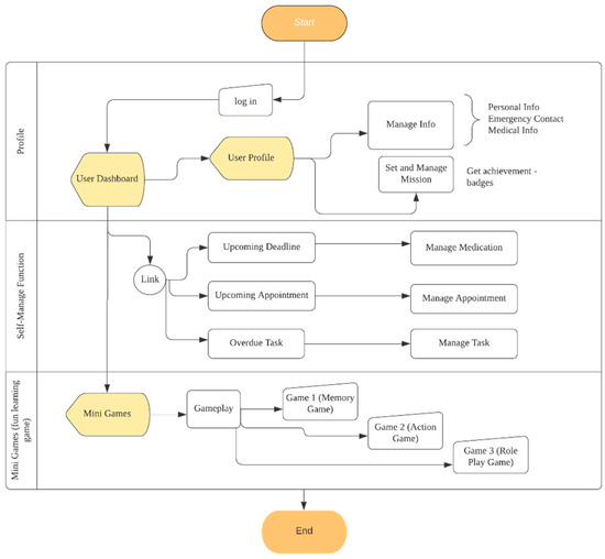 Based on the illustrated functions in Figure 3, the gamified application has three main sections: the user profile, self-management functions, and mini games. Users can manage their basic information via their user profile and add an emergency contact number and medical information (health condition) (refer to Figure 4). Self-management functions are presented through the dashboard (refer to Figure 5a). Users must manage their medication, appointments, and tasks related to their condition (refer to Figure 5b–d). Following the user design phase, three mini games will be installed, consisting of a memory game, an action game, and a role-playing game. The memory game involves memorizing matching pictures about food intake, the essential tools for diabetes, and healthy activity (refer to Figure 6a). Meanwhile, in the action game, users play an adventure activity in a given environment in which they have to collect essential items for a person with diabetes (refer to Figure 6b). For the role-playing game, a rogue-like game will be installed.