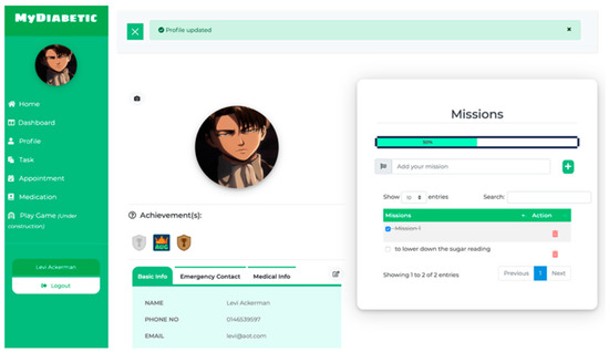 In the gamified diabetes application, several functions enable a person to manage their condition. The application requires a person to be registered. Once registered, they need to input and set the necessary information, such as their medication, appointments, tasks related to health targets, and other related treatment. Personal information and health-related data were also needed, for example, emergency contact details, physician details, allergies, and other co-morbid medical conditions. The application also implemented the concept of a personal dashboard, which was designed with the element of progression. This element shows the percentages completed monthly for each component. Visually displaying individual progress at a particular stage makes patients aware of their health status, particularly how well they are coping with their blood sugar control and current existing condition.