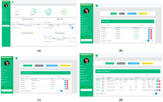 (a) Gamified application—Dashboard and progression; (b) Gamified application—Manage task; (c) Gamified application—Manage appointment; (d) Gamified application—Manage medication record.