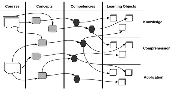 Learning objects have been described differently, but for this study, a learning object (LO) is a reusable digital resource with a specific learning goal that can be used to support learning [5]. Figure 1 shows the relationships between concepts, competencies, and learning objects. A course can be represented by many concepts, and concepts can be cross-referenced in several courses. For each concept, there are several competencies, with each aiming to achieve a specific learning objective. Each competency is to be instructed by one or more LOs, with each attaining different learning objectives according to a subset of Bloom’s Taxonomy of Learning [26].