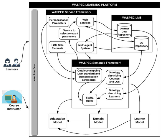 Figure 2 describes the architecture of WASPEC, which is highly modular, allowing for interoperability with different LMSs. It is also flexible, which permits efficient modification and scalability. Personalisation on the platform is achieved by extending the LMS with web services, plugins, and adding semantic components. The WASPEC learning platform comprises three major high-level components: an LMS, a service framework, and a semantic framework.