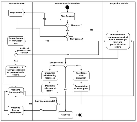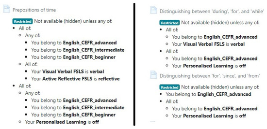 The set of possible parameters (and dimensions) that were adopted in this design include the level of knowledge (beginner, intermediate, advanced), language (English, Romanian), learning style (Felder-Silverman Learning Style [20]), media preference (text/image, audio, video, illustration), and motivational level (low, medium, high). The learner’s level of knowledge, in a particular knowledge domain, has been observed to be the most dominant personalisation parameter in e-learning systems [4,5,10].