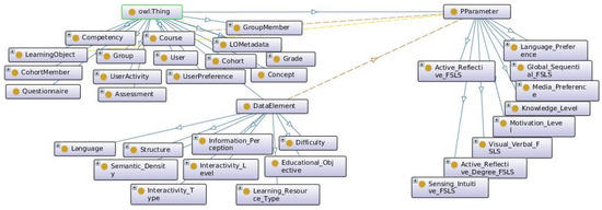 The main classes of the ontology include Assessment, Cohort, Competency, Concept, Course, DataElement, Grade, Group, LearningObject, LOMetadata, Parameter, Questionnaire, User, UserPreference, and UserActivity. The basic organisation of a course is described by the Course class. Each course, represented by competencies and concepts, has learning objects that are used for instruction. The LOMetadata class describes the property of each learning object with the elements of the DataElement class, which is subsequently mapped to the Parameter class. The User class describes users on the platform. The Group class defines features of users which are course-specific, while the Cohort class defines features that are platform-wide.
