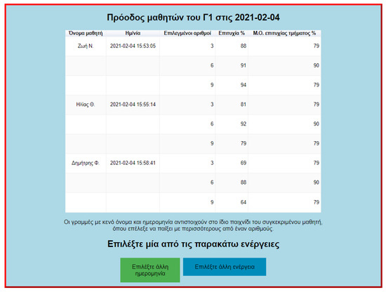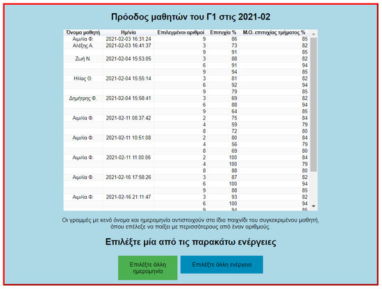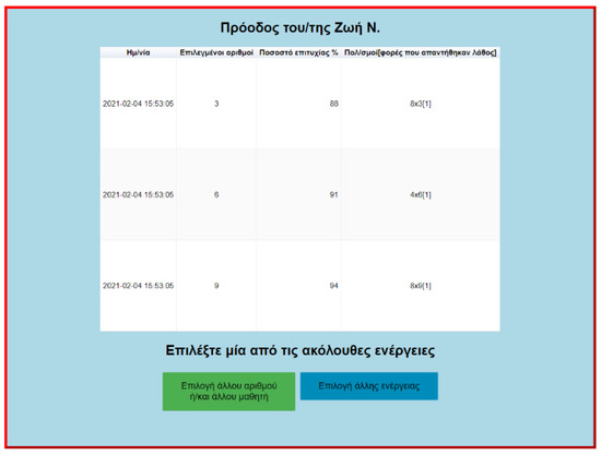 Through the MG dashboard, the teacher can monitor the progress of the pupils—the progress of each individual student either overall or for a selected training number—and keep track of the student’s game dates, the selected numbers for each game, the overall success rate and mistakes, as well as the frequency of each mistake. Figure 1 depicts a dashboard instance where the teacher chose to see the overall activity of student named “Ζωή Ν.”.