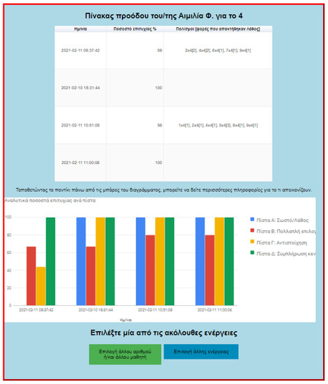 The MG offers teachers insight into their pupils’ multiplication skills (progress/evaluation and history). By using the MG, a teacher can be discharged from the time-consuming correction of pupils’ schoolwork on paper (or significantly reduce this effort) using instead the detailed data and progress record of each student maintained by the MG. Depending on teacher’s selections, the MG collects selected data from the respective learner model (in the case of an individual student) or from multiple learner models (in the case of all the classmates), and they are presented in an adequate graphical form [104]. As already mentioned, visualization enables comprehension and communication [105], and it depicts a much clearer image for the human brain compared to words or numbers [106]. In this approach, data are presented mainly in the form of tables and barcharts [107]. The information presented via the dashboard is selected according to the criteria of supporting teachers to easily access and assess their pupils, self-assessing their teaching practice outcomes, expose common mistakes of the particular student group, identify low achievers (in order to be more supported) and also help to (re-)arrange teaching process in the special needs of the pupil group (based on the feedback by the above visualizations).