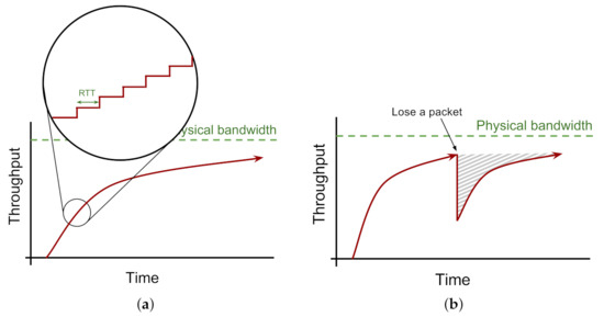 One inherent challenge in designing CCA algorithms is to provide efficient bandwidth utilisation [17,18,19]. Based on the described packet delivery acknowledgement, for higher RTTs it takes longer for the CCA to increase the sending rate. In addition, the higher the bandwidth, the longer it takes to fully utilise the available physical bandwidth. As a result, the performance of classic network protocols can be sub-optimal in so-called high bandwidth-delay-product (BDP) networks, identified to have high capacity (i.e., bandwidth), and relatively high latency (i.e., delay, represented by RTT) [20].