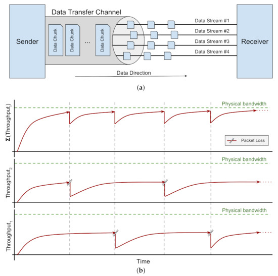 Parallelism and Data Striping: One of the most popular techniques to optimize data transfers over WANs is to establish multiple connections in parallel, striping data over them between two ends (Figure 2a). As a result, if some streams experience a decrease in the sending rate due to packet loss, the overall rate will not experience a significant drop due to other concurrent streams sending at full rate (Figure 2b) [21,22]. This technique is well investigated and widely applied on top of the TCP protocol. There are several research projects which provide parallel protocol solutions for wide-area data transfer, ranging from prototypes to full-fledged tools and frameworks. GridFTP is one of the most popular data transfer protocols in this category [2]. Parallel Data Streams (PDS) is another tool that stripes data over either cleartext (TCP) or encrypted (SSH) parallel connections [23]. Multipath TCP (MPTCP) is another proposal to utilise multiple connections but in a different dimension. Rather than establishing parallel connections over the same network connection, MPTCP advocates for creating concurrent connections over different interfaces available to the host [24,25].
