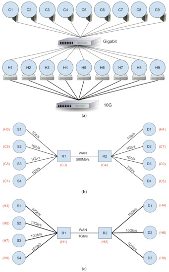 The network configuration parameters are summarized in Figure 5a, depicted in Figure 4. For Overlay-1, all links (except the intended bottleneck) are rated at 1 Gb/s and the emulated bottleneck bandwidth between and is set to 500 Mb/s. For Overlay-2, network links (except the intended bottleneck) are rated at 10 Gb/s, and the emulated WAN bandwidth between and is 1 Gb/s. The hardware configuration for Overlay-1 and Overlay-2 nodes are provided in Figure 5b,c. As noted earlier, 40 Gb/s and faster WANs are currently available, but our observations and results are mainly orthogonal to the raw bandwidth of the underlying network (Section 6.1 and Section 6.2).