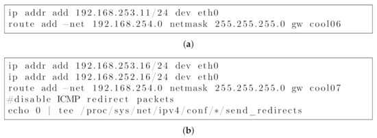 Figure 6 lists the set of commands for configuration of the end-nodes (Figure 6a) and the virtual router nodes (Figure 6b).