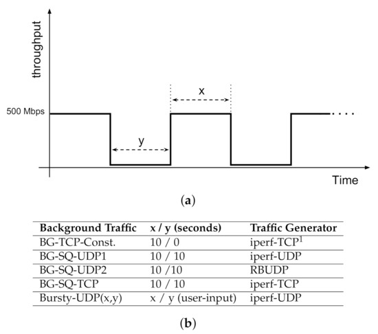 - Square-waveform TCP (BG-SQ-TCP): same as previous scenario, except that data bursts are generated using iperf generating TCP traffic.